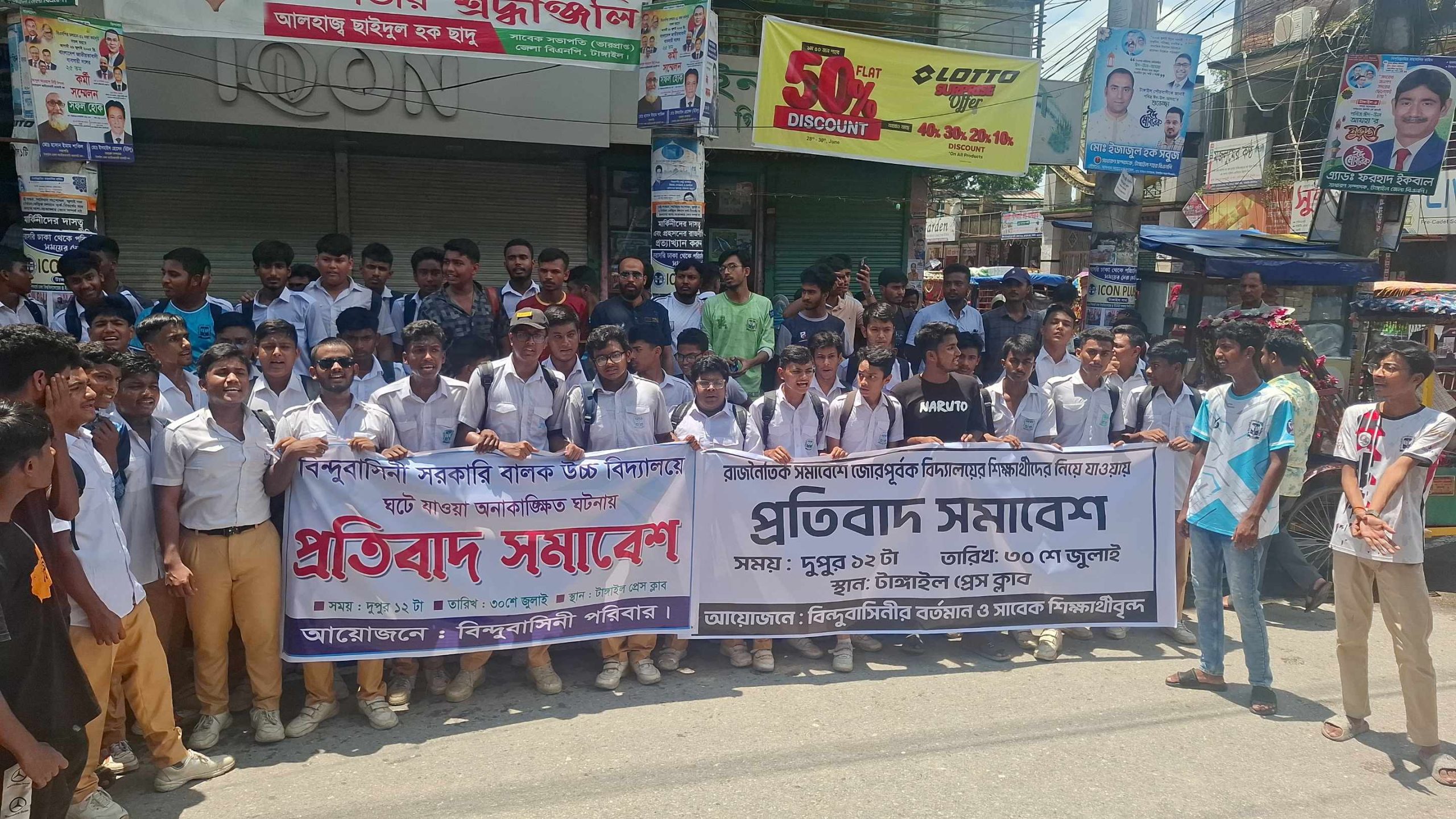 জাতীয় নাগরিক পার্টির (এনসিপি) দেশ গড়ার প্রত্যয়ে ঘোষিত ‘জুলাই সমাবেশে টাঙ্গাইলের ক্লাস চলাকালীন জোরপূর্বক বিন্দুবাসিনী সরকারি উচ্চ বিদ্যালয়ের শিক্ষার্থীদের নিয়ে যাওয়ার প্রতিবাদে বিক্ষোভ মিছিল ও সমাবেশ অনুষ্ঠিত হয়েছে। বুধবার দুপুরে বিন্দুবাসিনীর বর্তমান ও সাবেক শিক্ষার্থীদের উদ্যোগে মিছিলটি বের হয়। বিক্ষোভ মিছিলটি শহরের গুরুত্বপূর্ণ সড়ক প্রদক্ষিণ করে টাঙ্গাইল প্রেসক্লাবে প্রতিবাদ সমাবেশে মিলিত হয়। এসময় বিভিন্ন স্লোগান দেয় বর্তমান ও সাবেক শিক্ষার্থীরা।